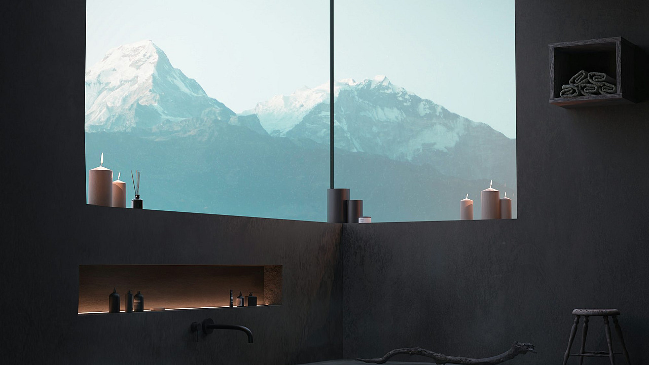 Escape to tranquility with this stunning wallpaper featuring a luxurious bathtub overlooking a breathtaking mountain vista. Perfect for a calming atmosphere.