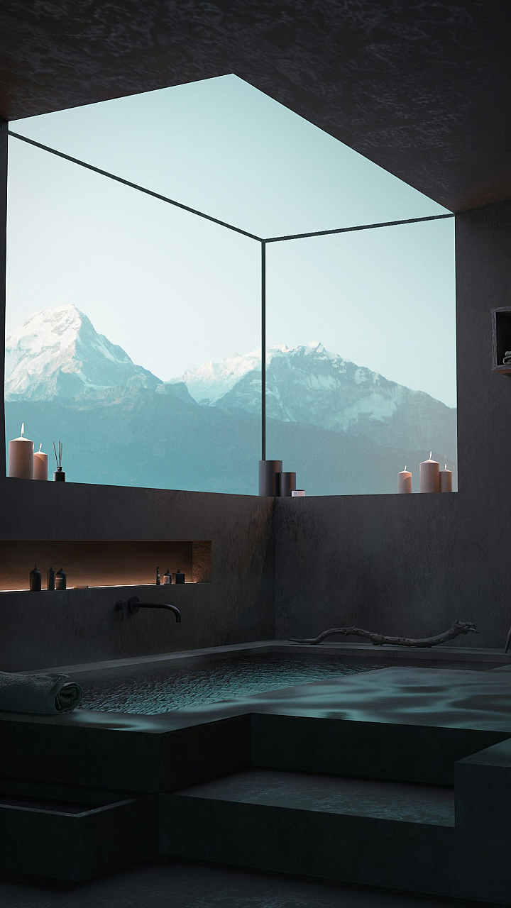 bathtub, mountain, view, landscape, relaxation, spa, nature, scenery, serenity, wallpaper