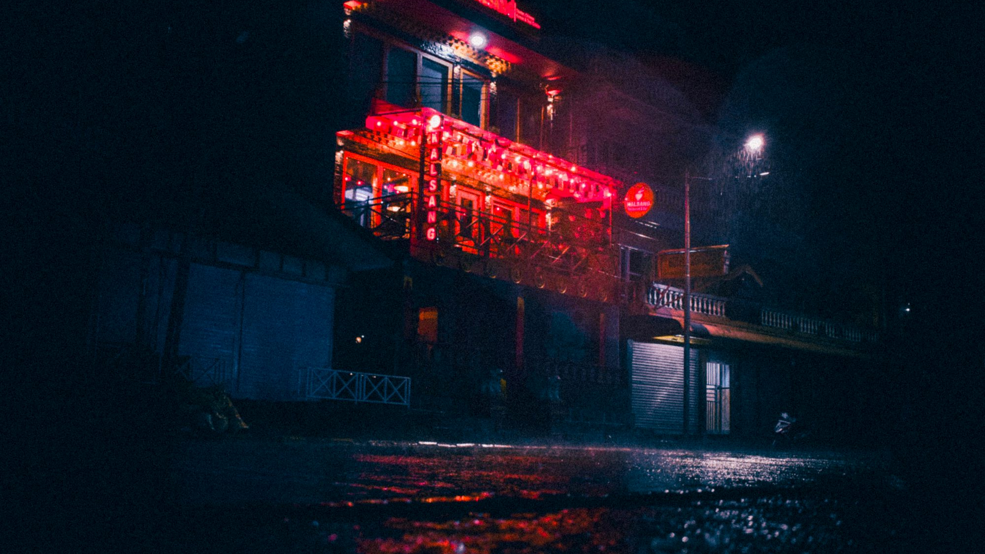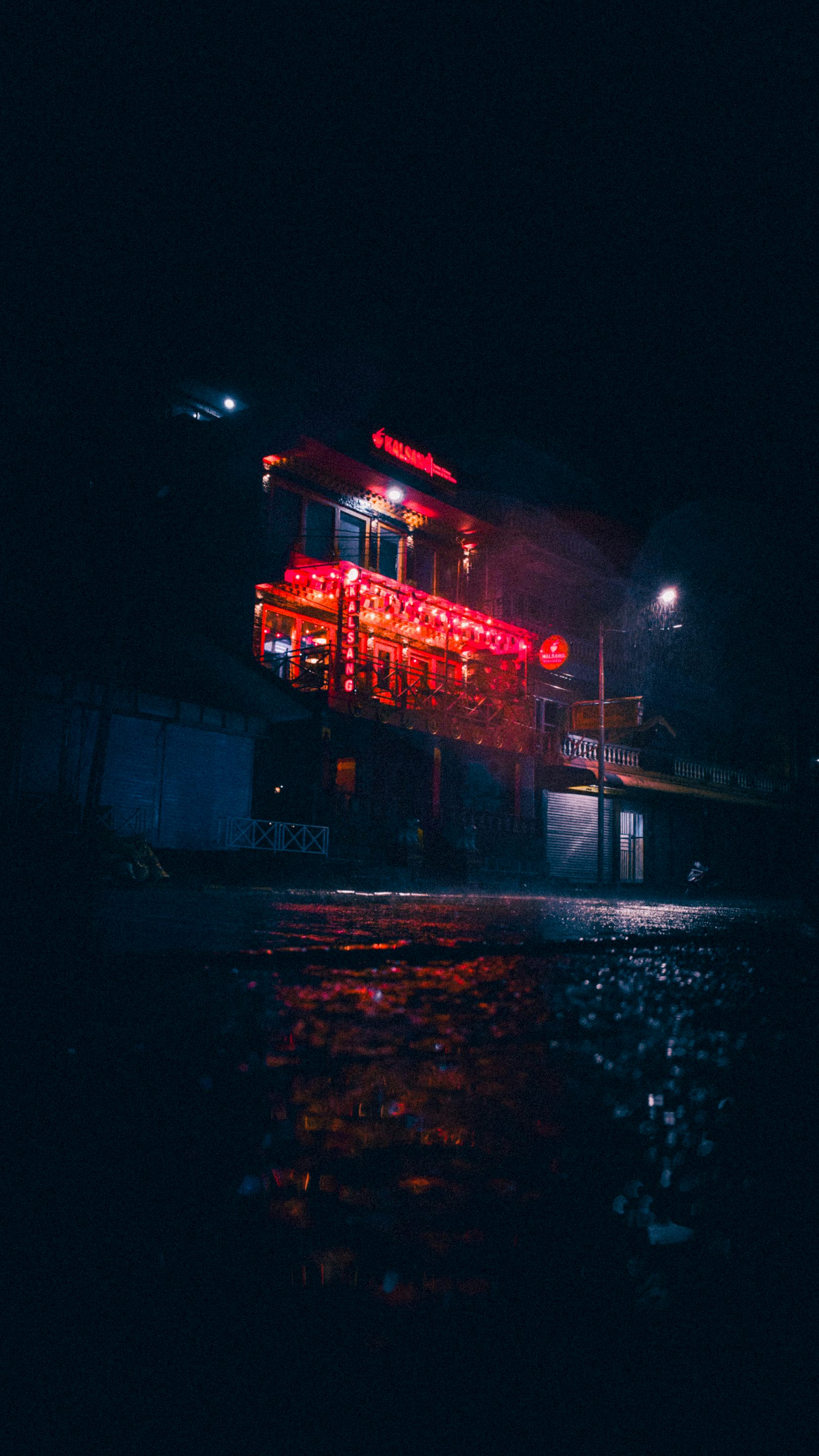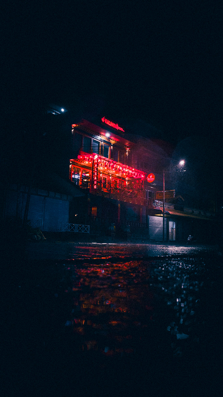 Wallpaper A Building with Red Lights at Night