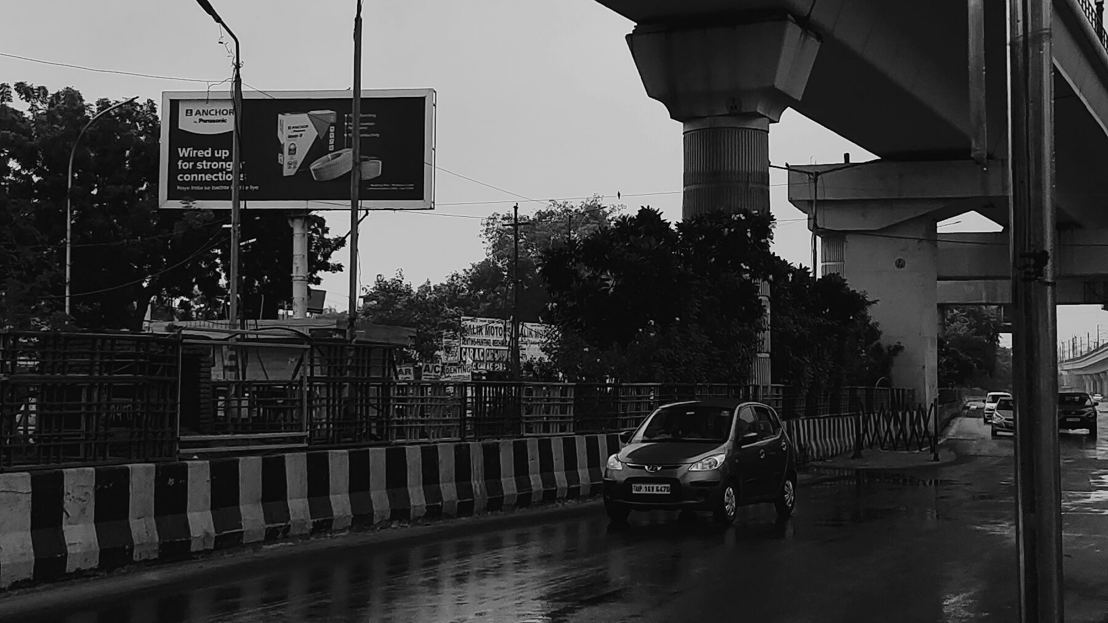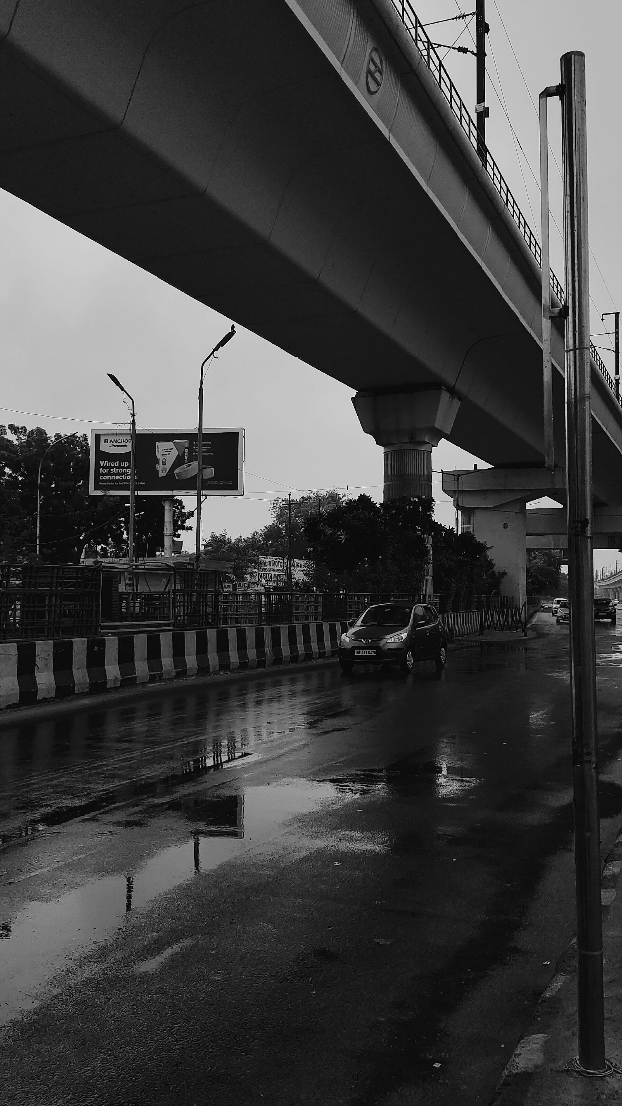 A dynamic wallpaper featuring a car speeding under a dramatic bridge. Perfect for those who love fast cars and urban landscapes.
