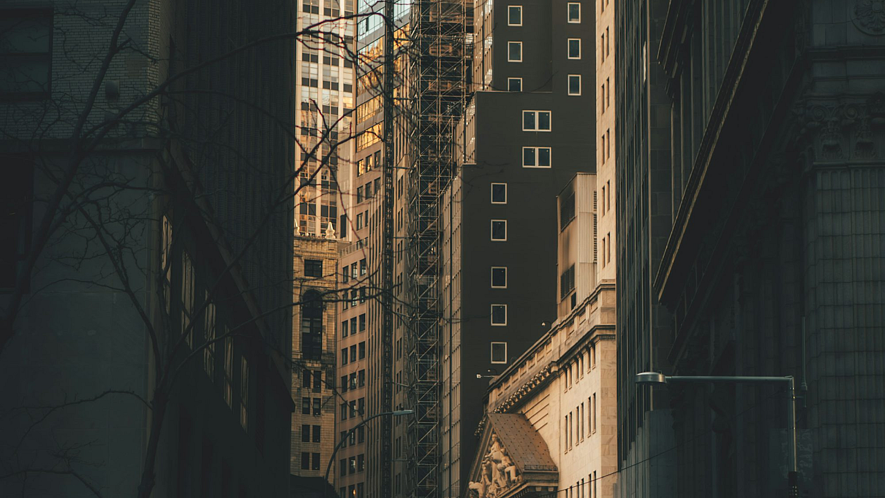 This wallpaper features a stunning view of a city street, with towering buildings forming a dramatic backdrop. Perfect for a modern, urban aesthetic.