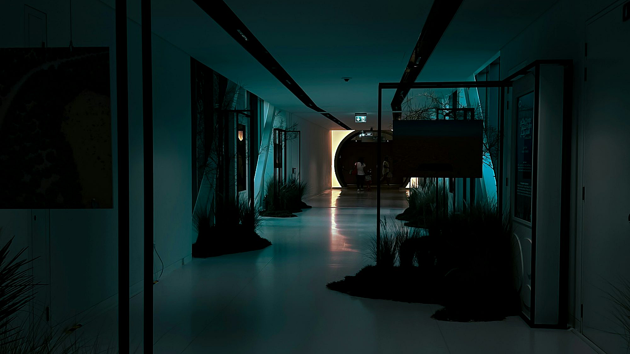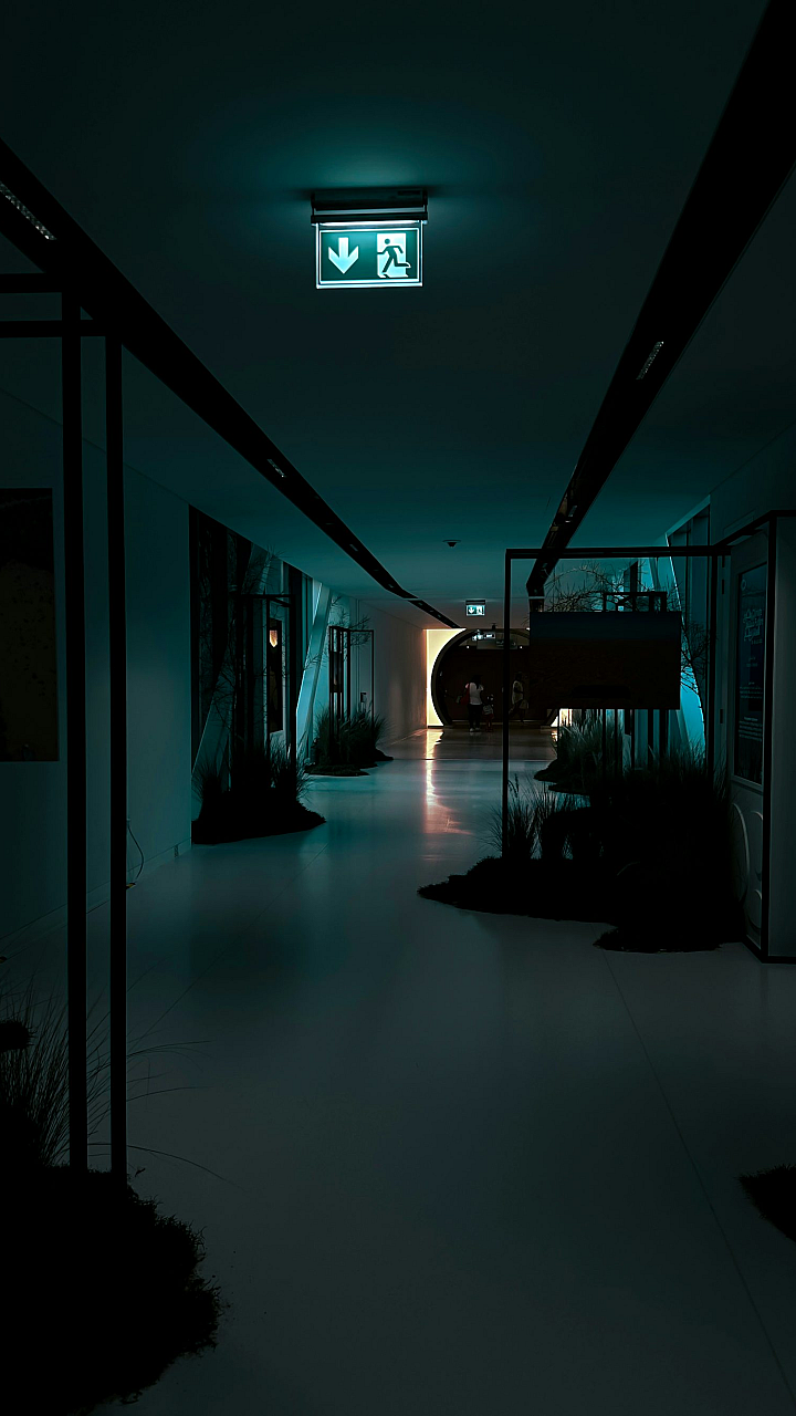 a dark hallway with a green light at the end