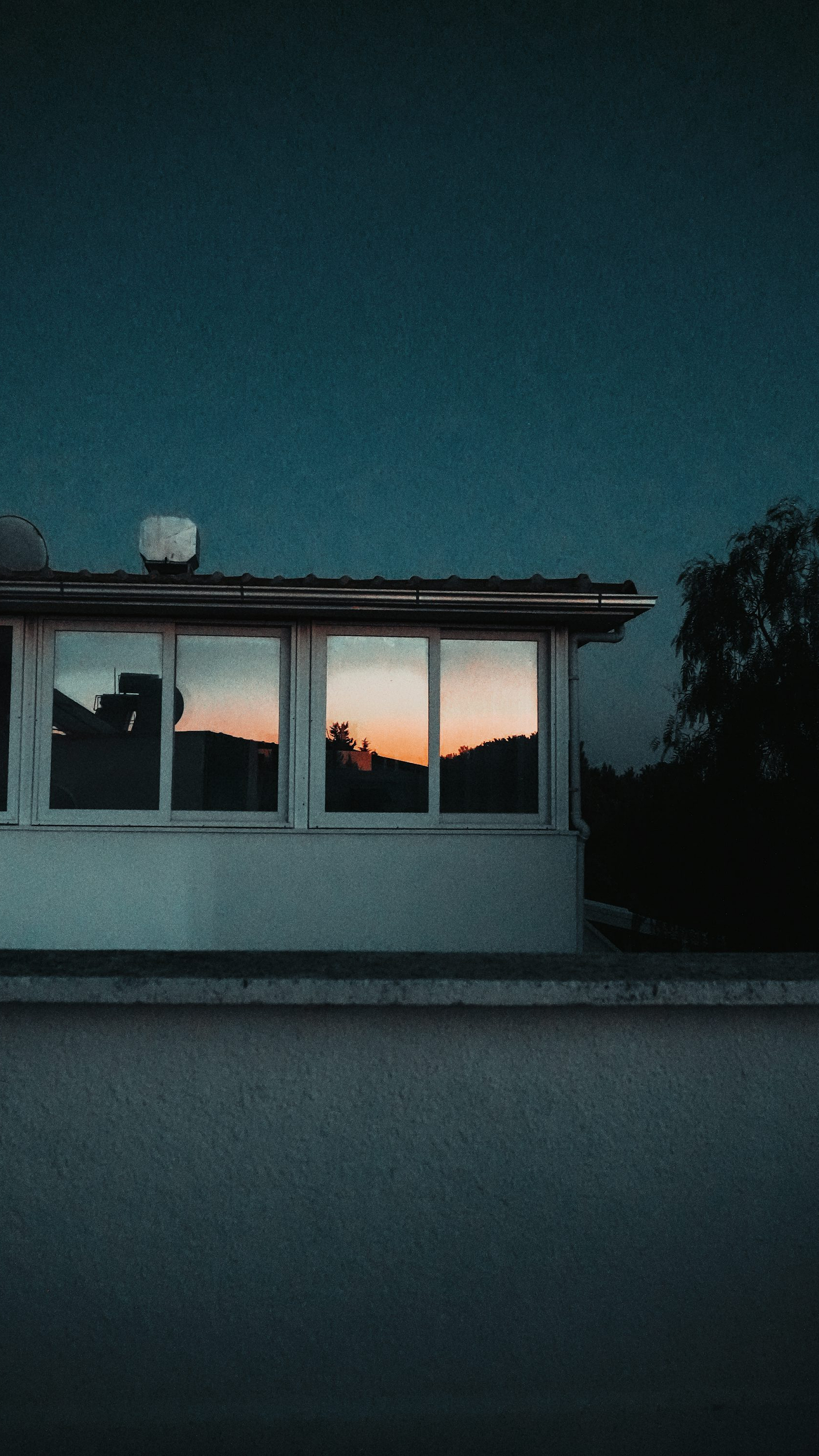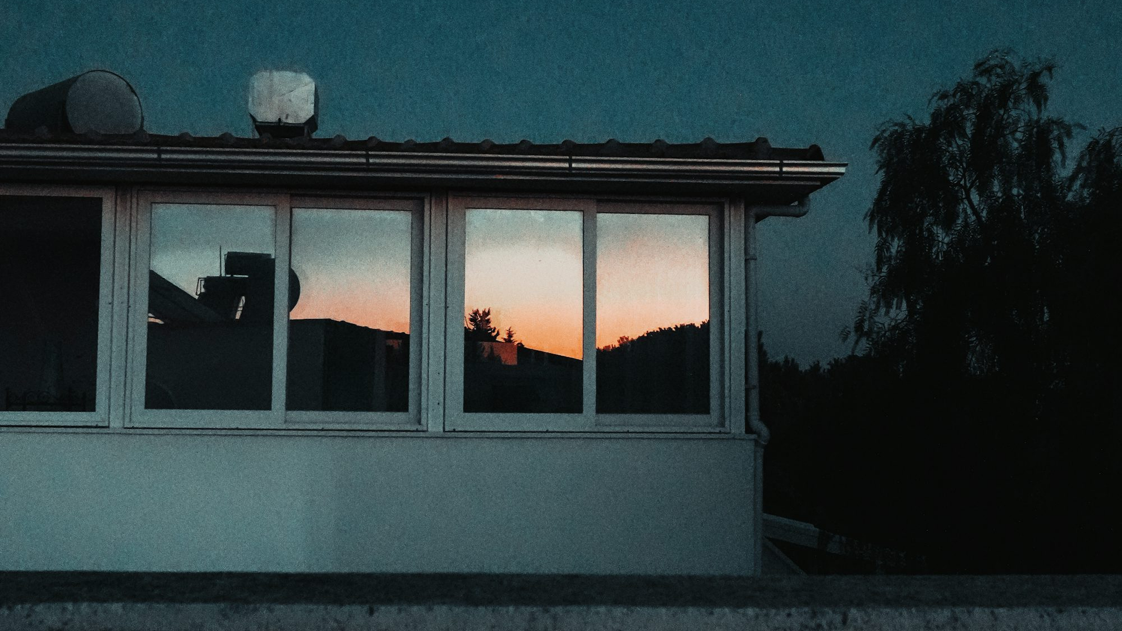 A serene night scene featuring a house with visible roof and windows, bathed in the soft glow of nighttime. Perfect for a calming desktop or phone background.