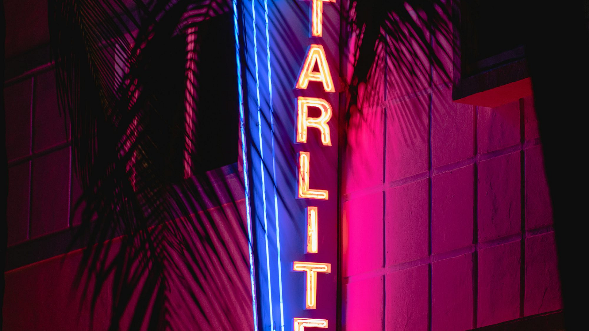 This vibrant wallpaper features a neon sign brilliantly lit against the side of a building at night, creating a captivating urban scene.
