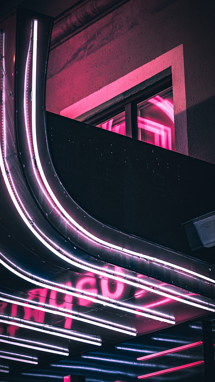 This wallpaper features a vibrant neon sign glowing brightly on the side of a building at night. Perfect for a modern or retro aesthetic.