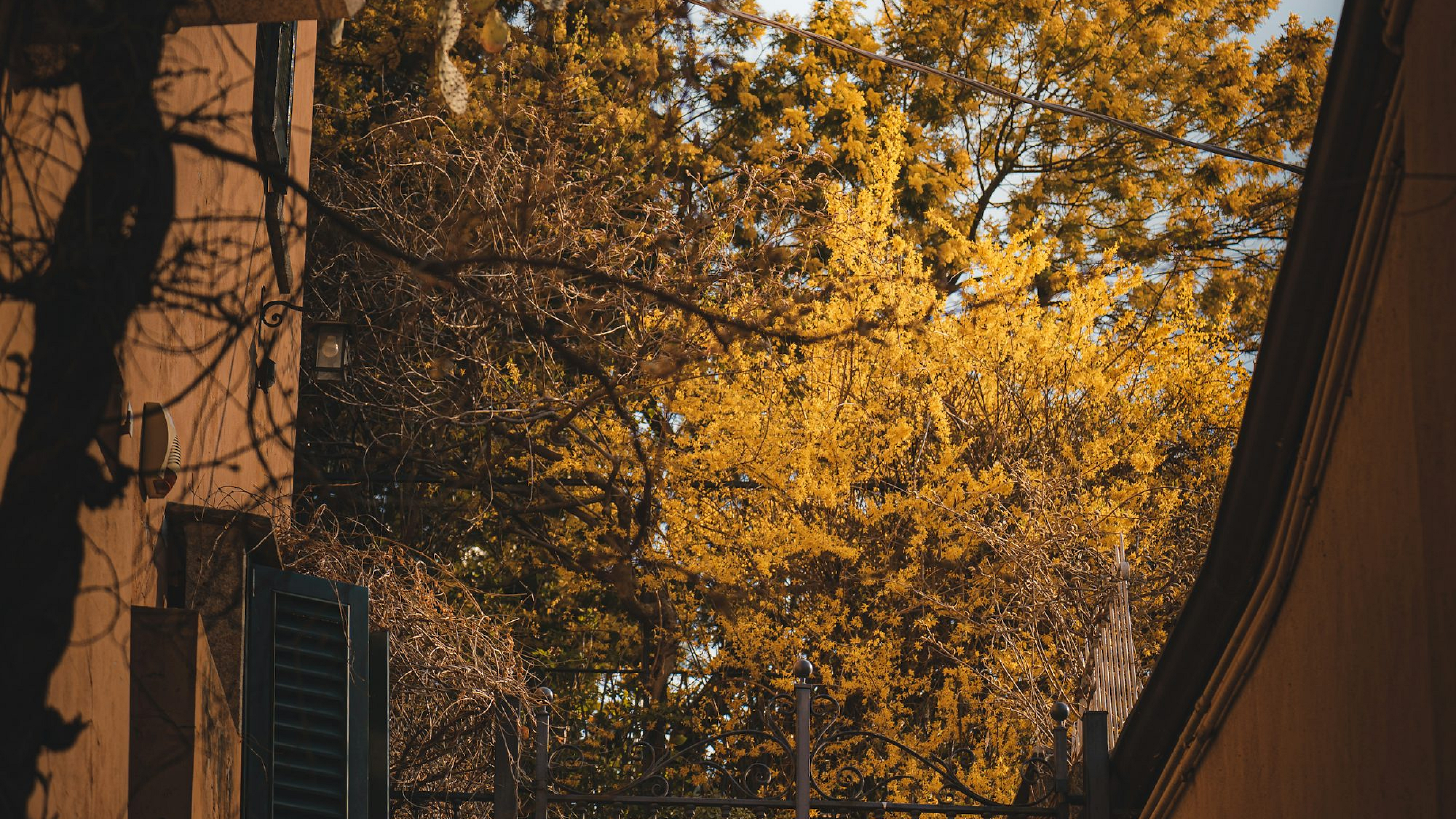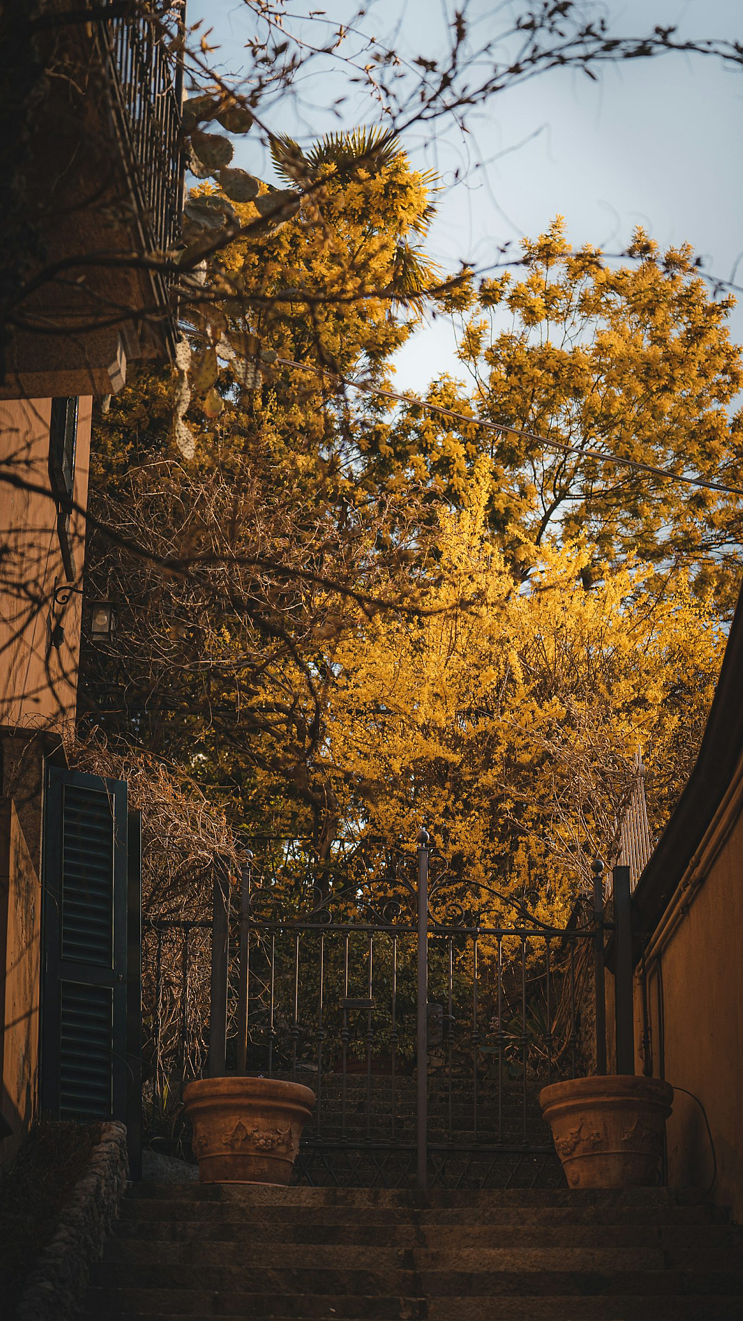 A tranquil scene: a stone staircase ascends towards a charming, tree-lined street, perfect for a peaceful wallpaper.