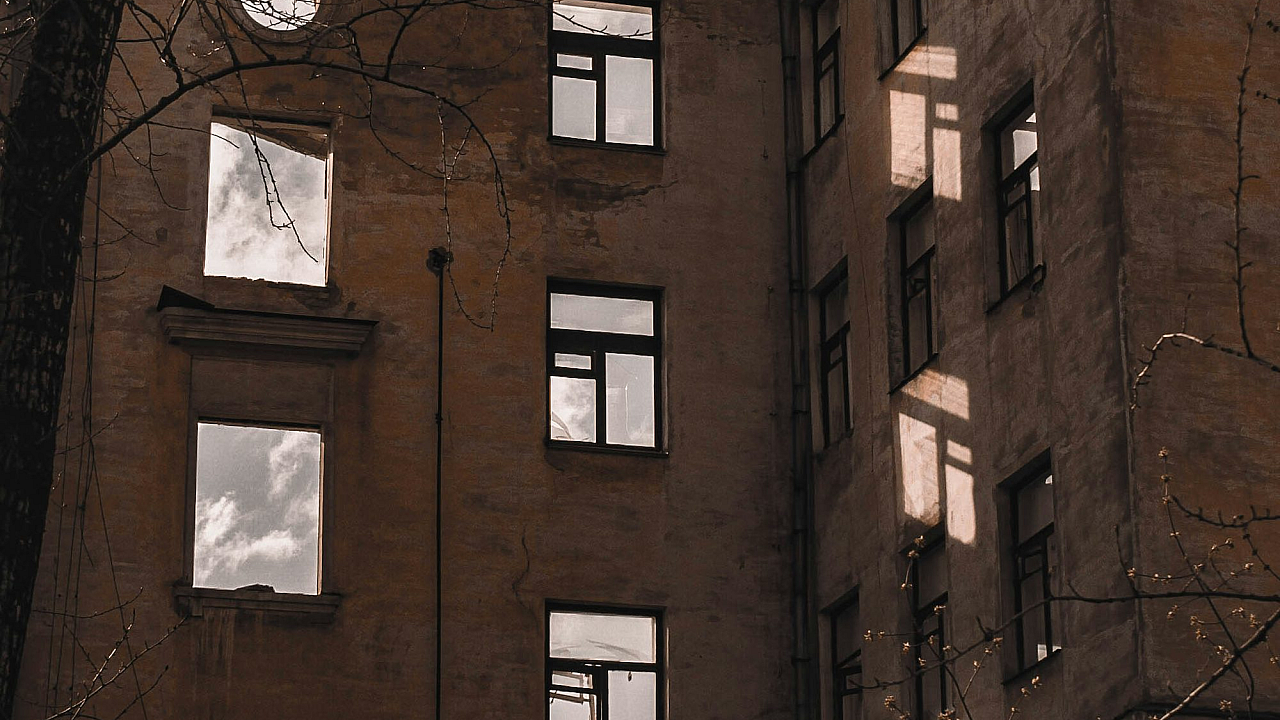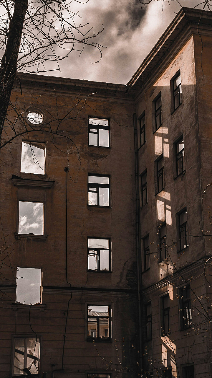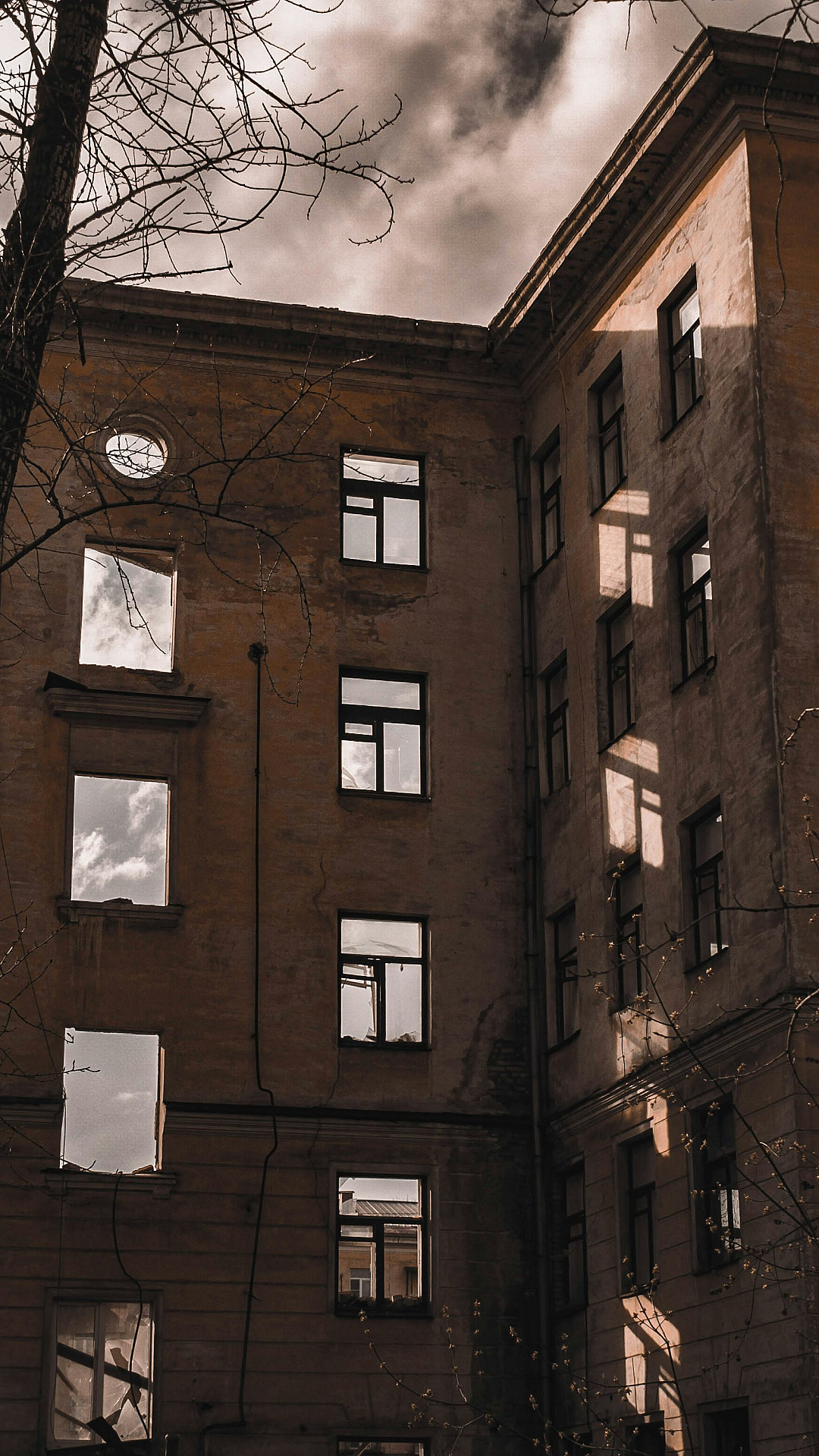 Wallpaper A Tall Building with Lots of Windows Next to a Tree