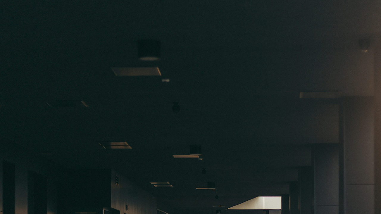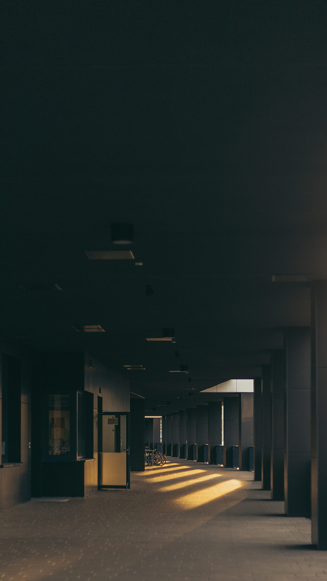 A minimalist wallpaper featuring an empty hallway in a building with a simple clock on the wall. Clean lines and a sense of quietude.