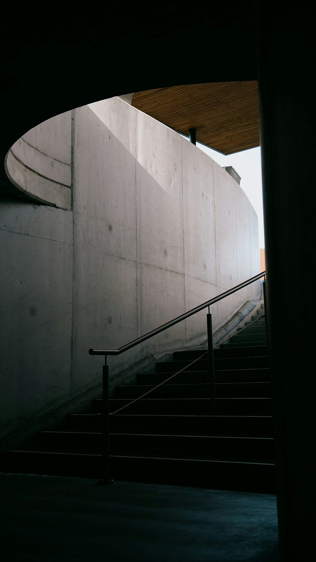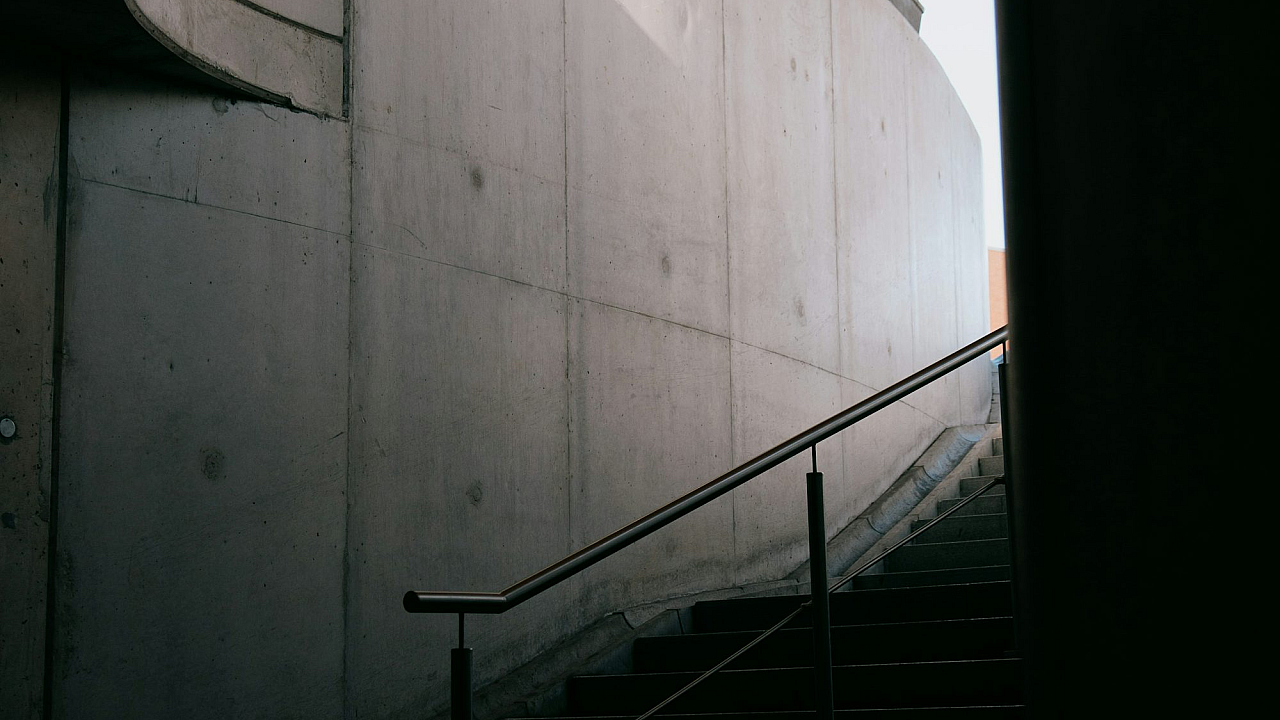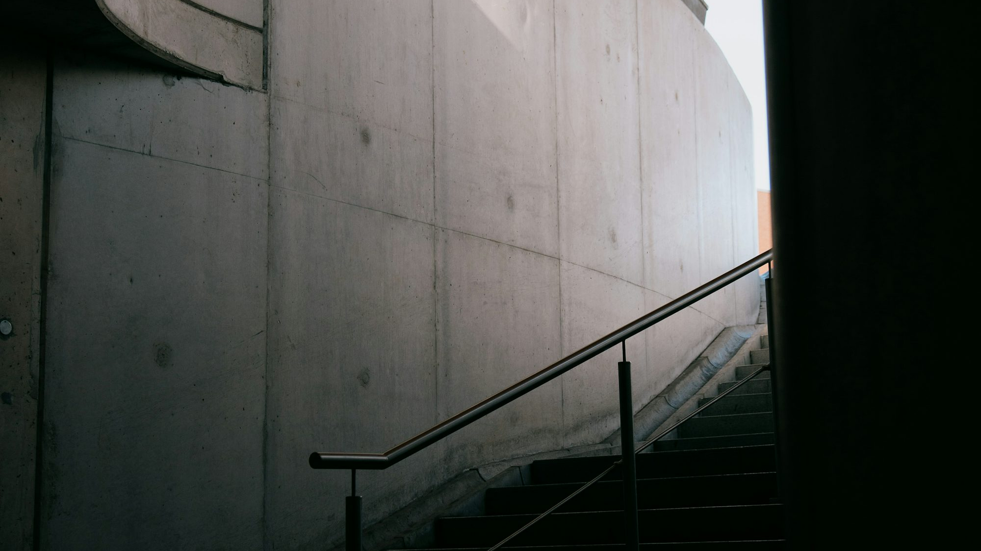 black metal staircase, white concrete wall, wallpaper, dark, modern, architecture, industrial, minimalist, stairs, concrete
