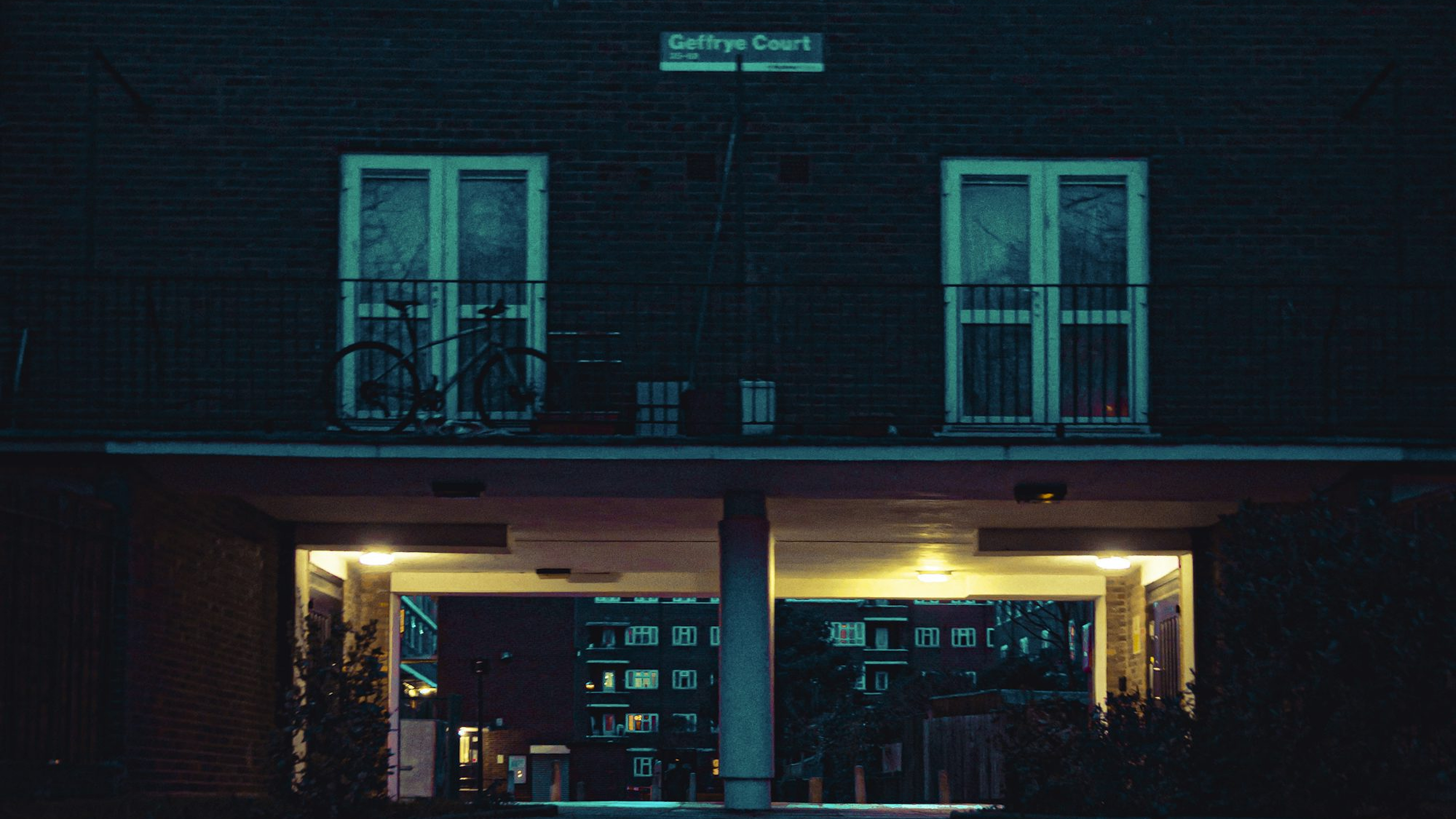 A stunning wallpaper featuring a blue and white concrete building bathed in the soft glow of nighttime lights. The modern architecture is beautifully highlighted.