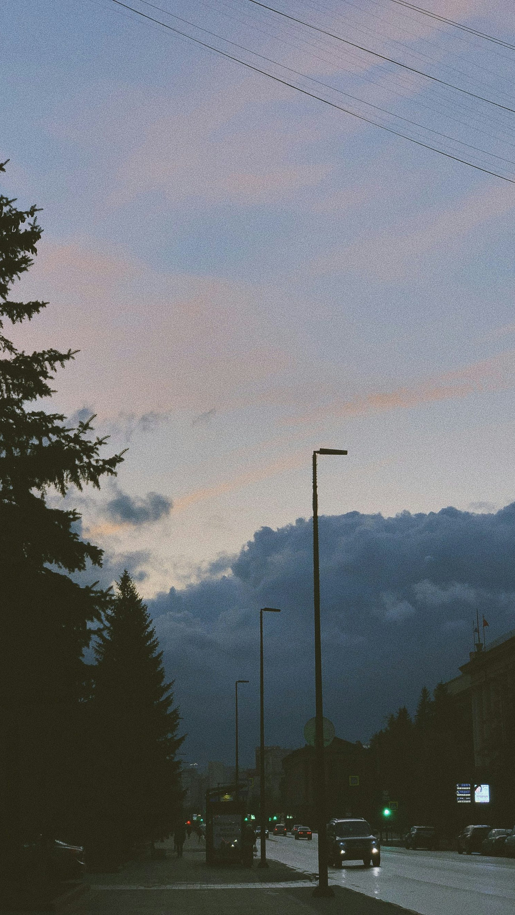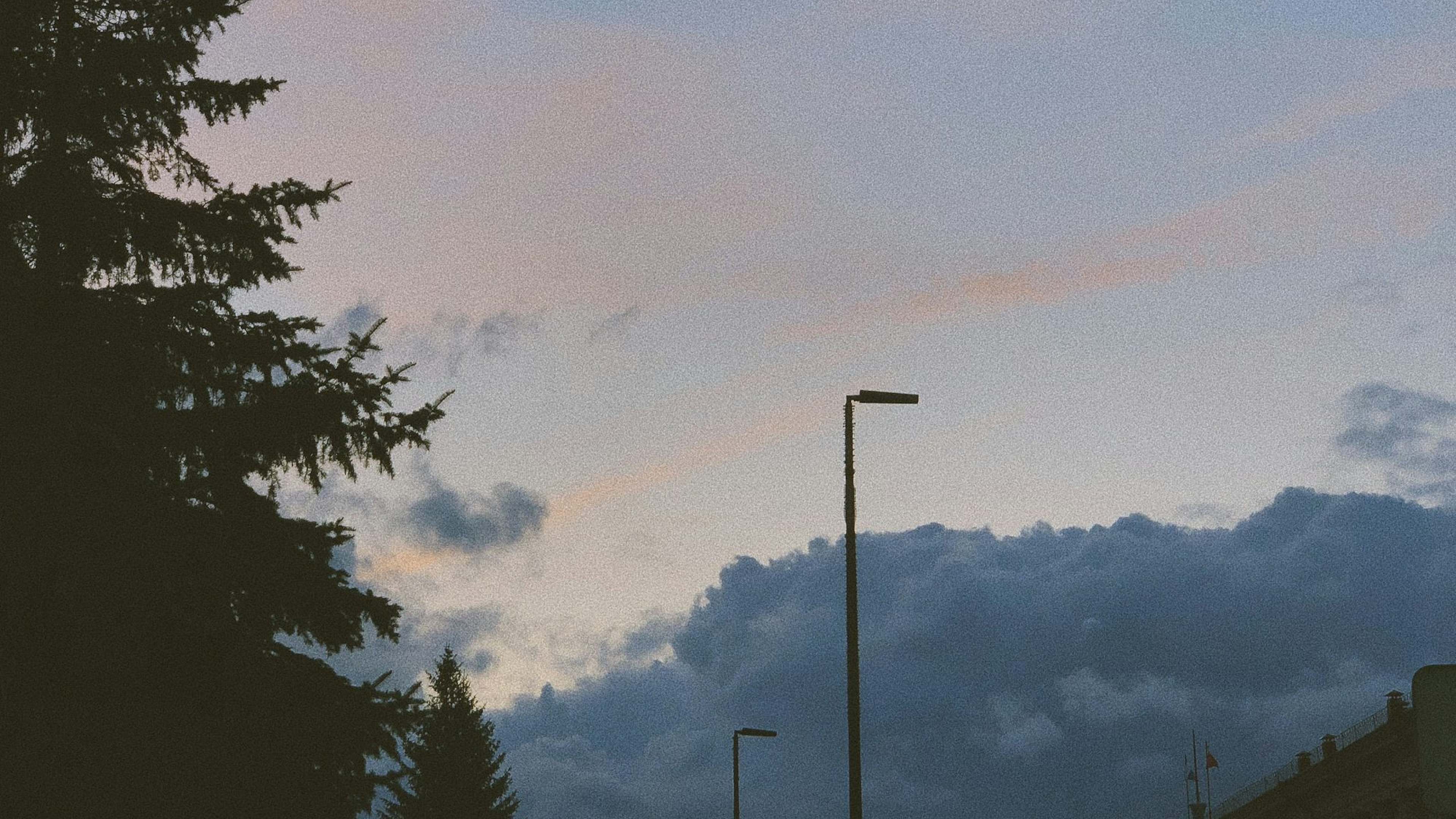 A serene evening scene featuring cars parked near a light post under the shade of trees. A perfect wallpaper for a calming desktop background.