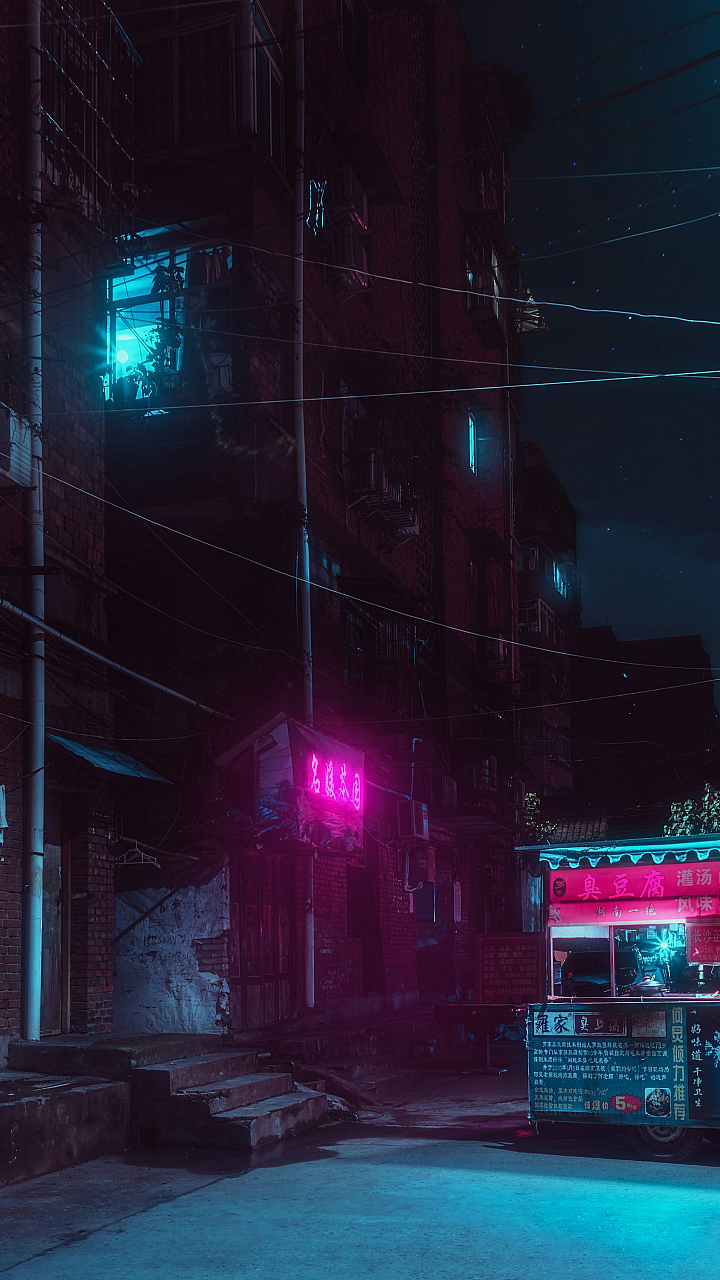 This wallpaper features a captivating view of a brightly lit store situated next to a building at night, creating a striking contrast against the dark surroundings. The image is perfect for adding a touch of urban flair to your device.