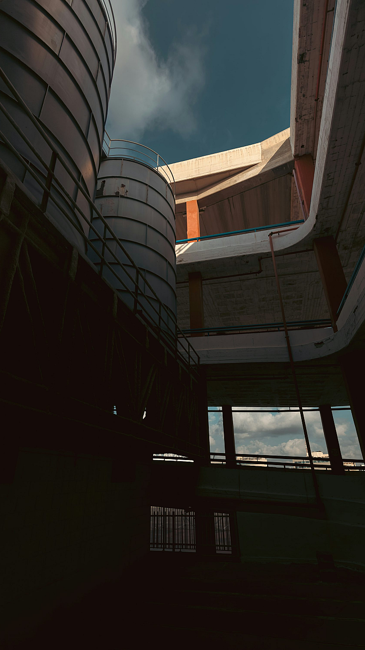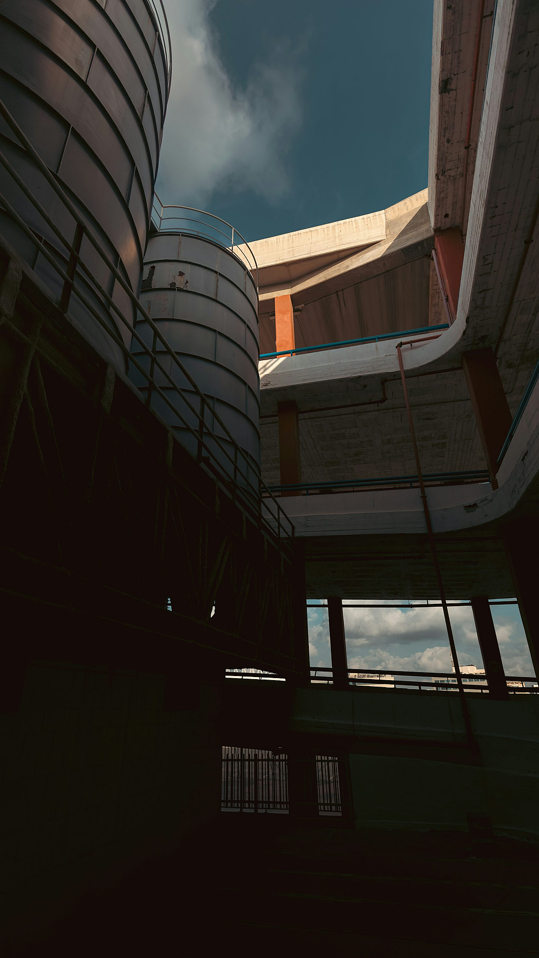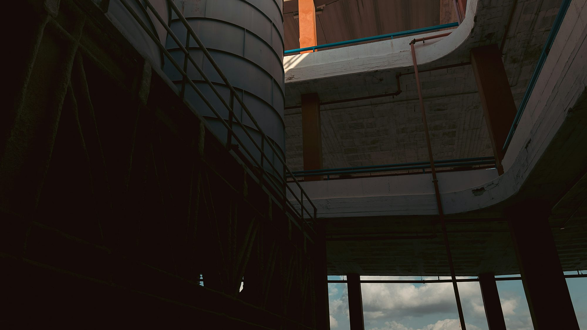 A stunning wallpaper featuring a dramatic upward view of a tall building against a vibrant sky. The image showcases impressive architecture and a captivating interplay of light and shadow.