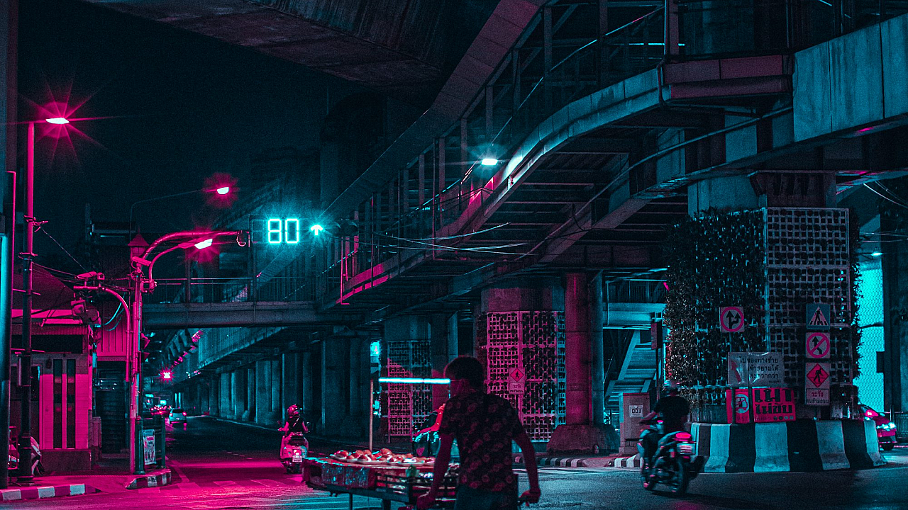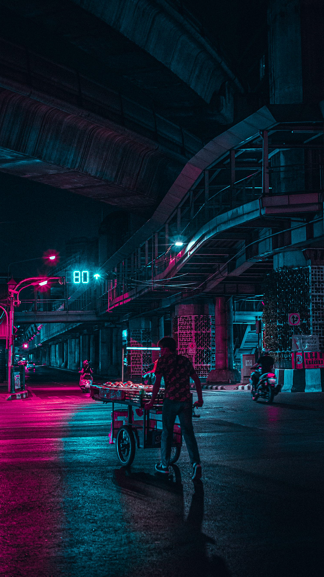 A captivating wallpaper featuring a man in a black jacket riding his bicycle down a dimly lit road at night. The image is full of mystery and atmosphere.