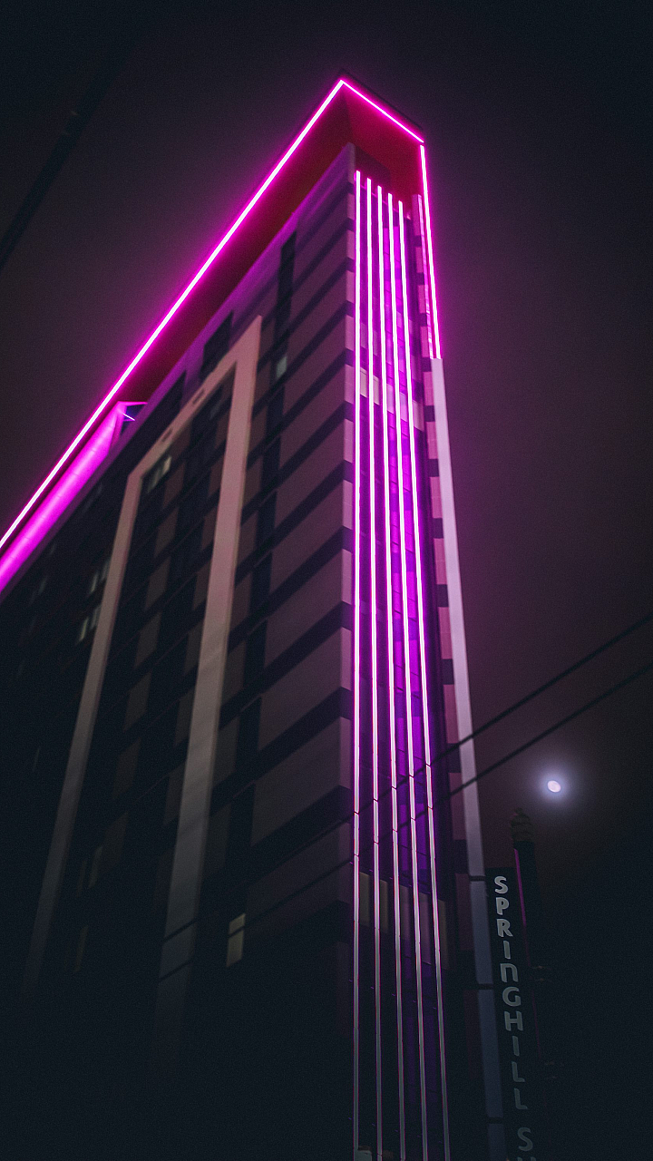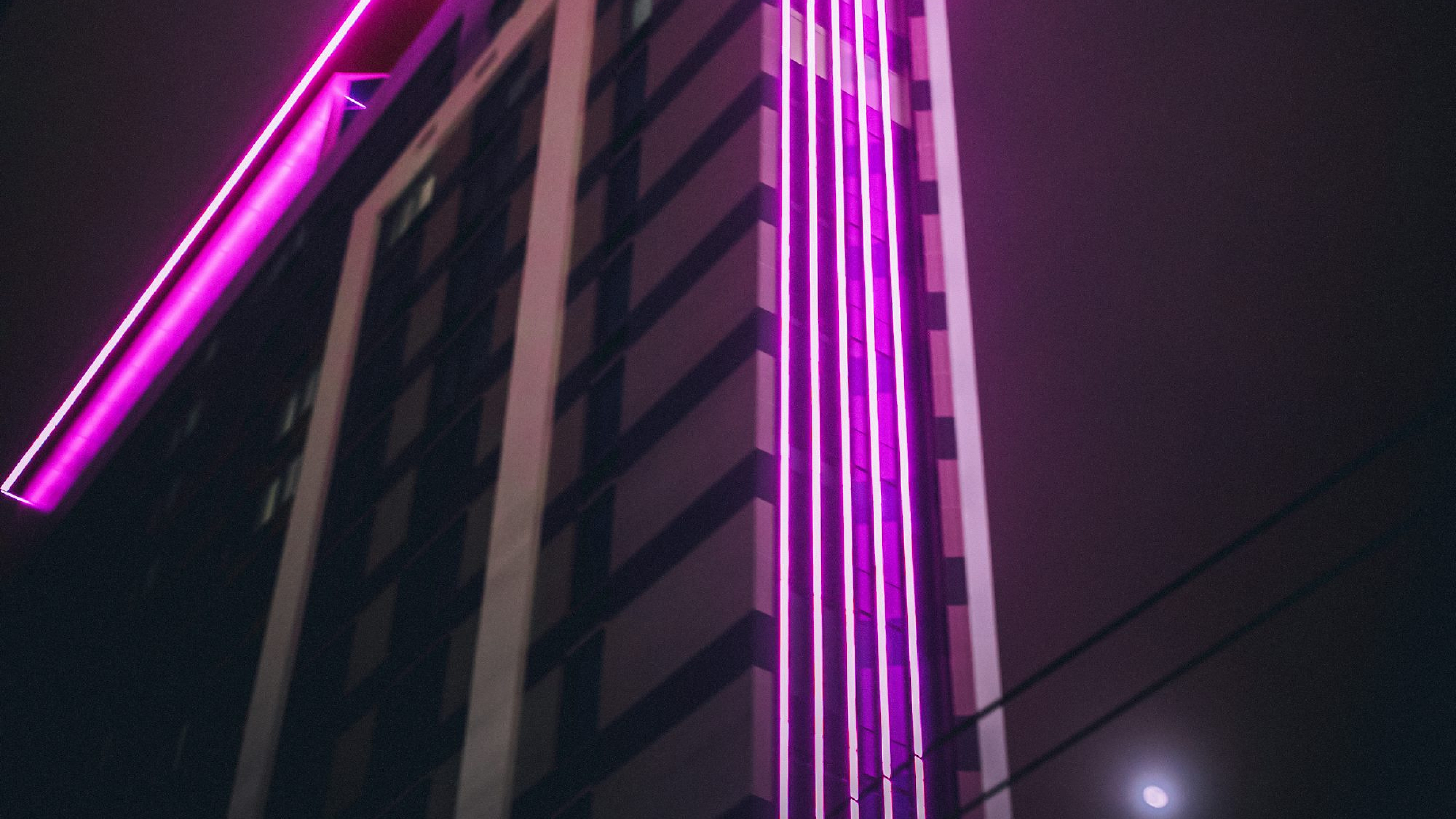 purple, light, building, architecture, cityscape, night, neon, urban, abstract, wallpaper