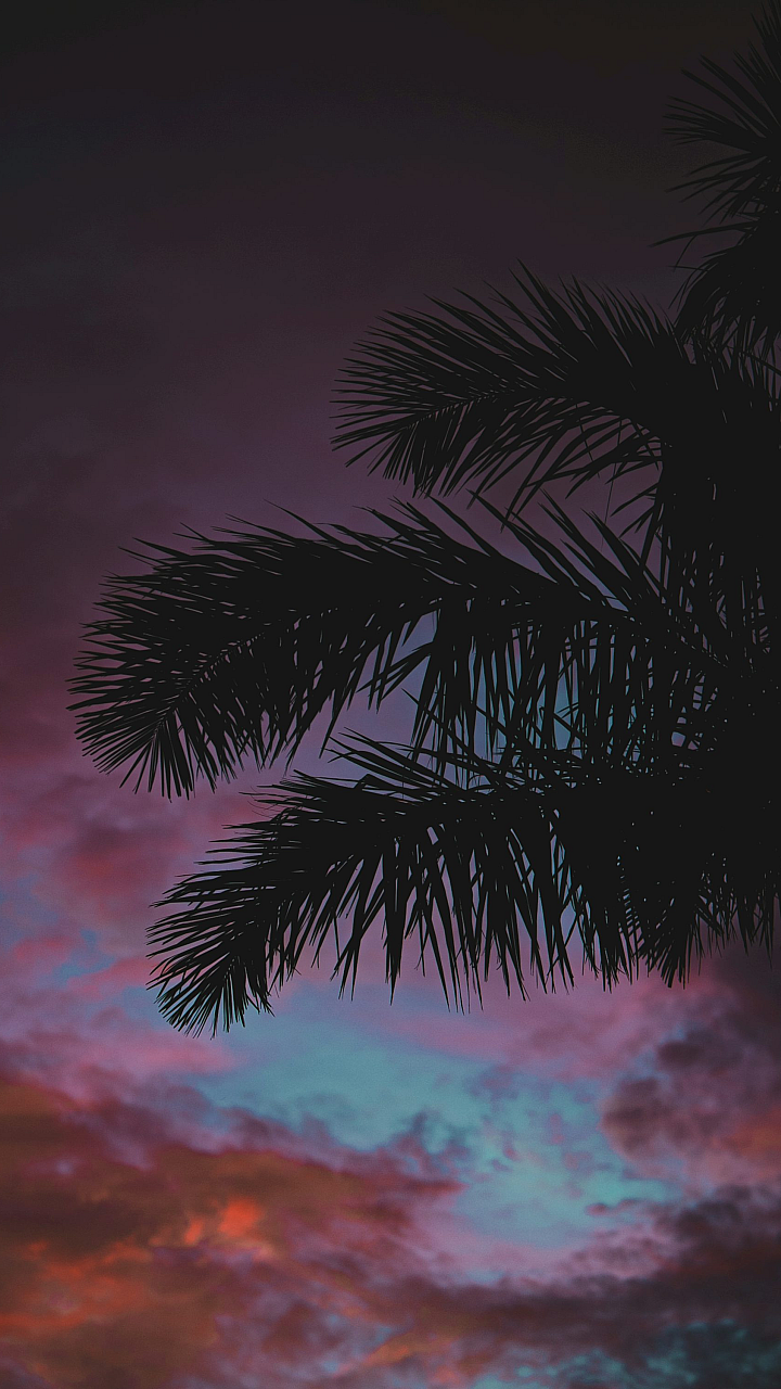 A stunning silhouette of a coconut palm tree against a vibrant sunset. Perfect for a tropical-themed wallpaper, bringing a piece of paradise to your screen.
