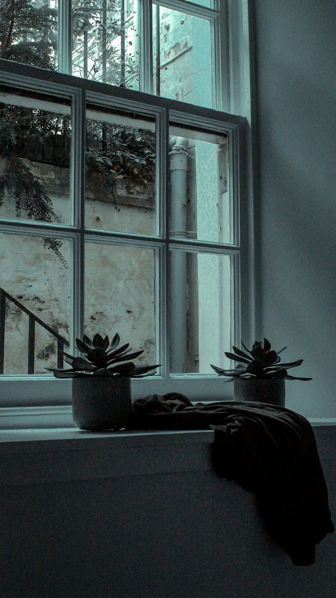 A serene image featuring two succulents thriving beside a bright pane window, perfect for a calming desktop or phone background.