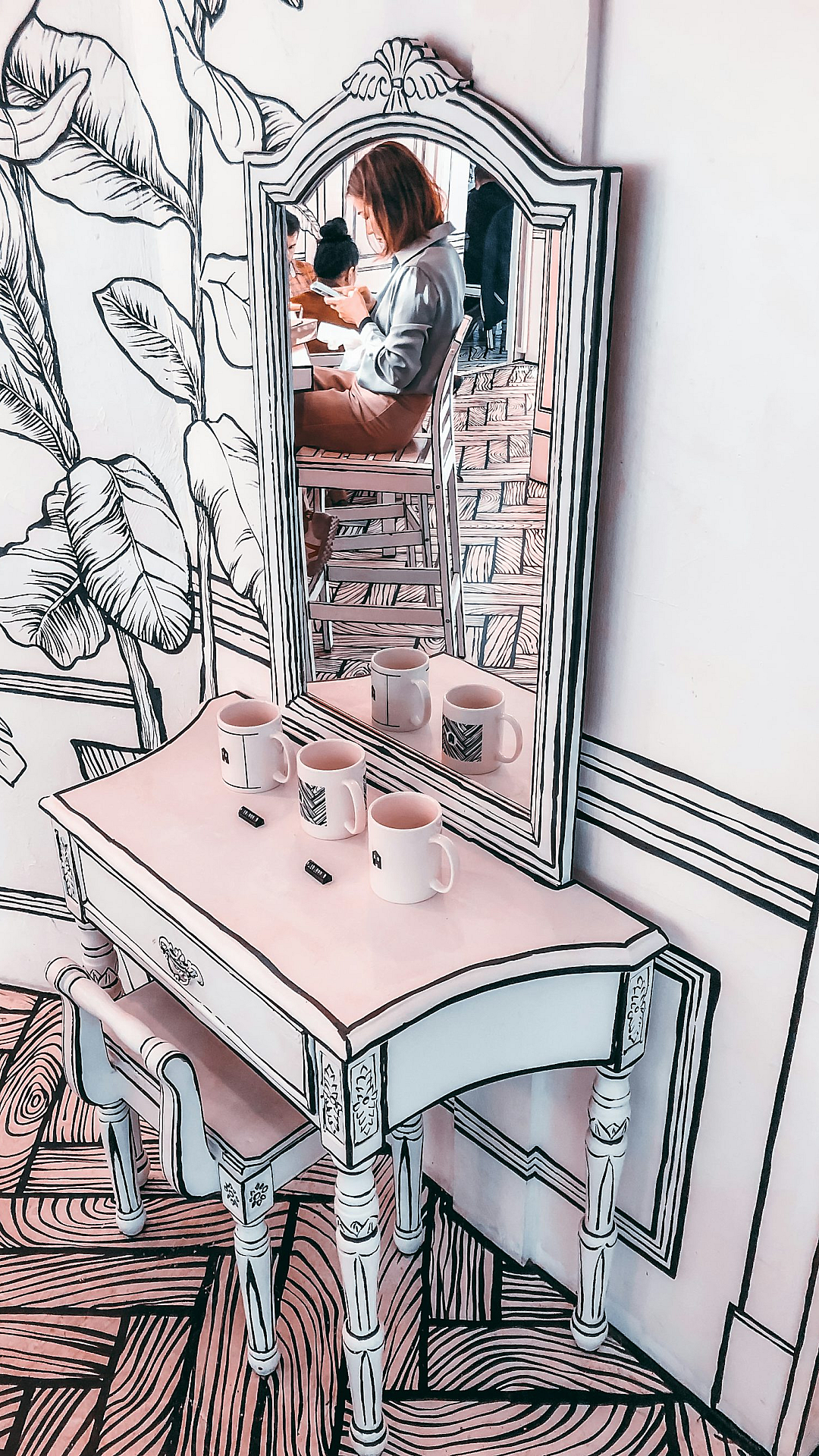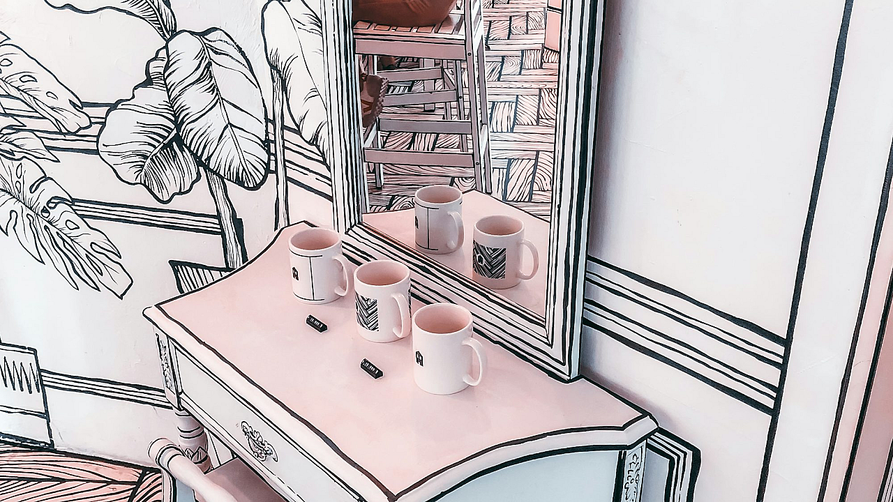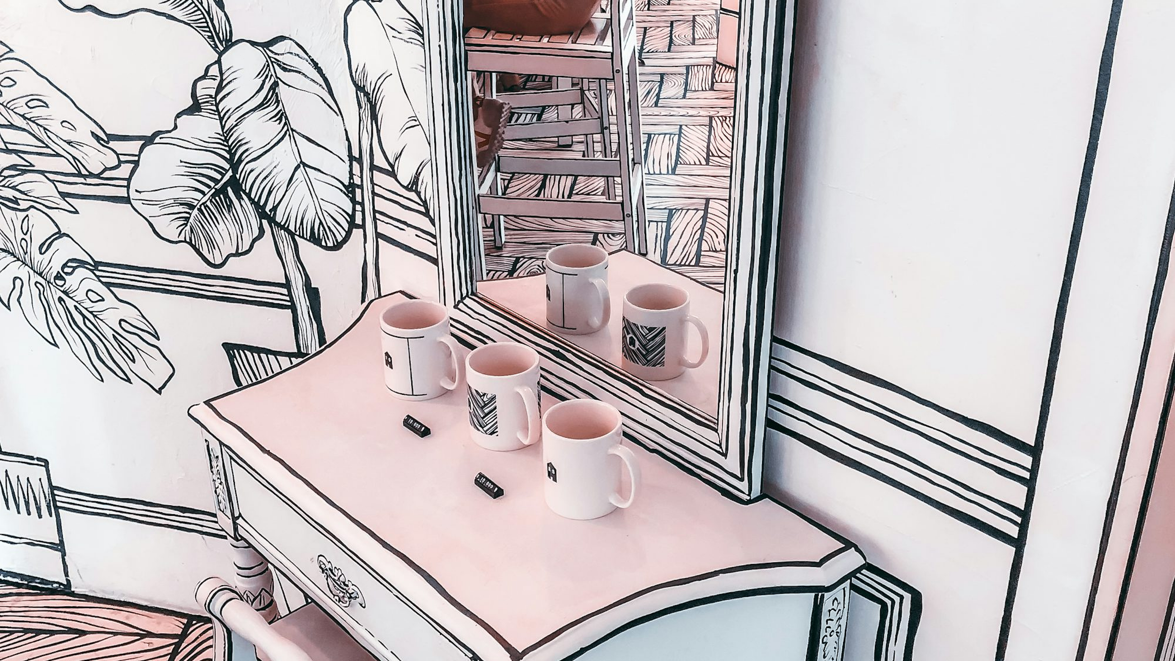 This wallpaper features a clean and simple image of a white wooden table accompanied by two chairs, perfect for a minimalist aesthetic.
